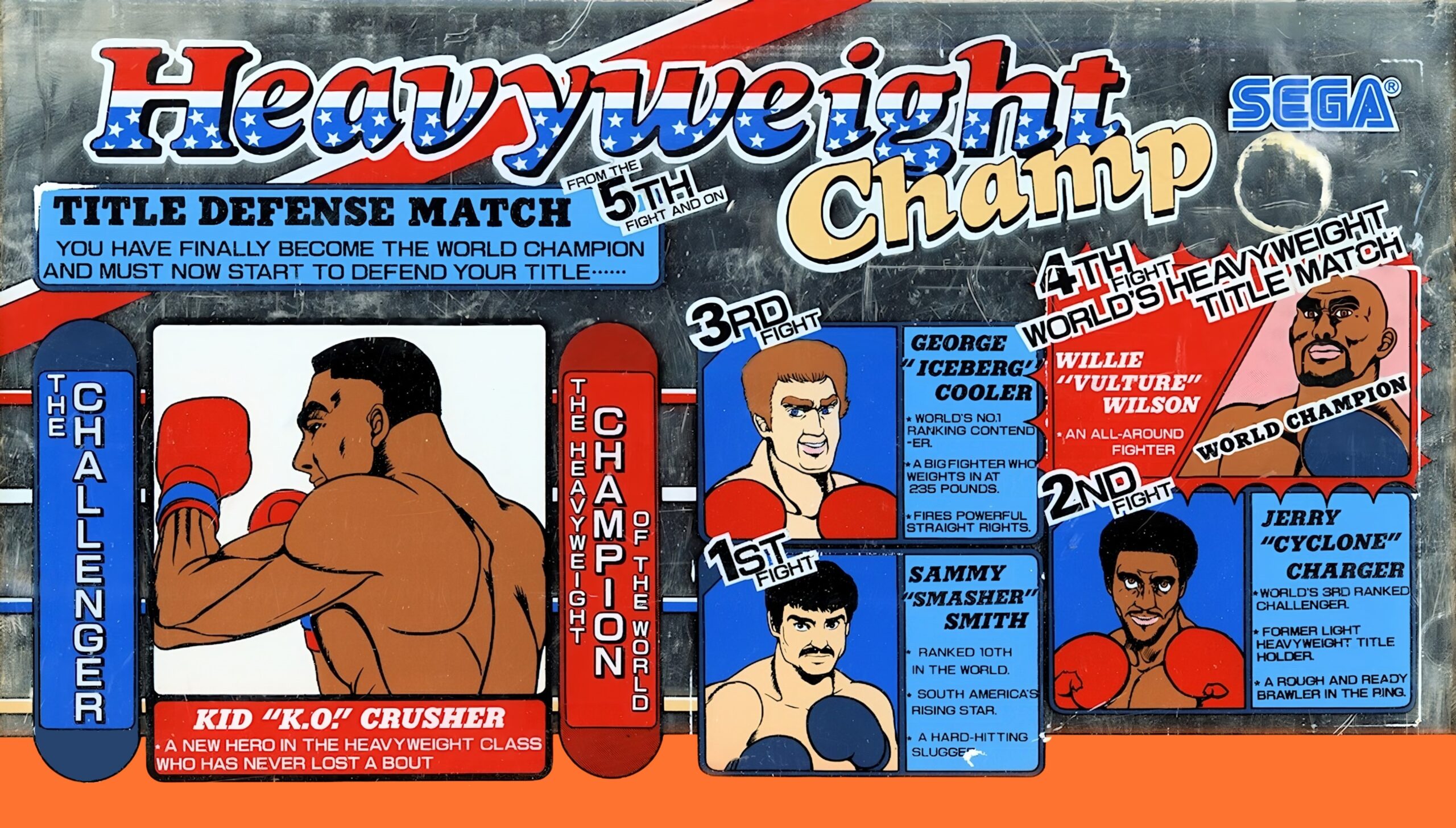 Sega’s Heavyweight Champ series, released in arcades in 1976, is widely credited as one of the first video games to feature hand-to-hand fighting. While the graphics were in black and white, the cover art featured 2 Black fighters, Kid “K.O.” Crusher and Jerry “Cyclone” Charger. Jerry “Cyclone” Charger is described as: ‘World’s 3rd-ranked challenger, a former lightweight title holder, and a rough and ready brawler in the ring. Jerry “Cyclone” Charger is the second fighter in the lineup of fighters in the Heavyweight Champ game. Kid “K.O.” Crusher is described as: “A new hero in the heavyweight class who has never lost a bout”. He is the final fighter you face in the Heavyweight Champ game and is tough. Kid “K.O.” Crusher feels like he was inspired by Muhammad Ali, who in 1976 fought 4 times, defending his heavyweight title, and his last knockout win was against Richard Dunn.